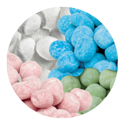 Sirop de glucose-fructose, farine de blé, sucre, eau, humectant (sirop de sorbitol), amidon de maïs, graisse de palme, acidifiants (acide citrique), arôme, émulsifiant (mono- et diglycérides d'acides gras), colorants (E120), agents d’enrobage (E901, E904).