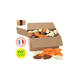 Pâte et beurre de cacao, sucre, poudre de lait entier, pulpe d’orange, pomme, dextrose, fibres d’ananas, gélifiant : E401, stabilisant : E341ii, correcteur d’acidité : E330, arôme naturel d'orange, sirop de glucose, crème fraîche, beurre salé d’Isigny A.O.P., poudre de lait écrémé, fleur de sel de Guérande, farine de riz, sel, amandes, miel, pain azyme (fécule de pomme de terre, eau), blanc d’œuf, arôme naturel de vanille, émulsifiants : lécithines soja - E476.